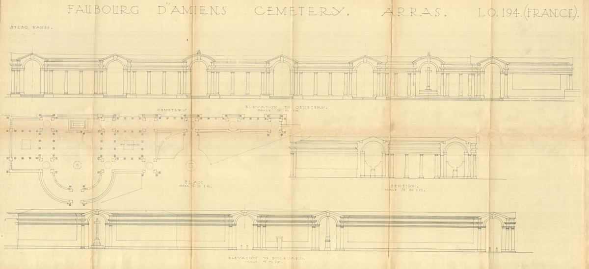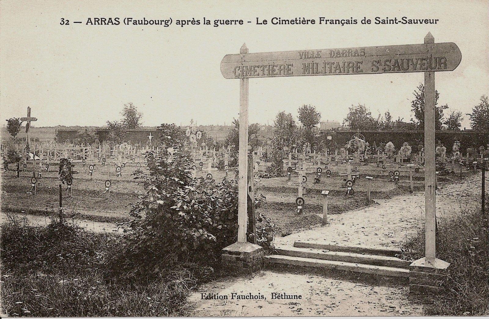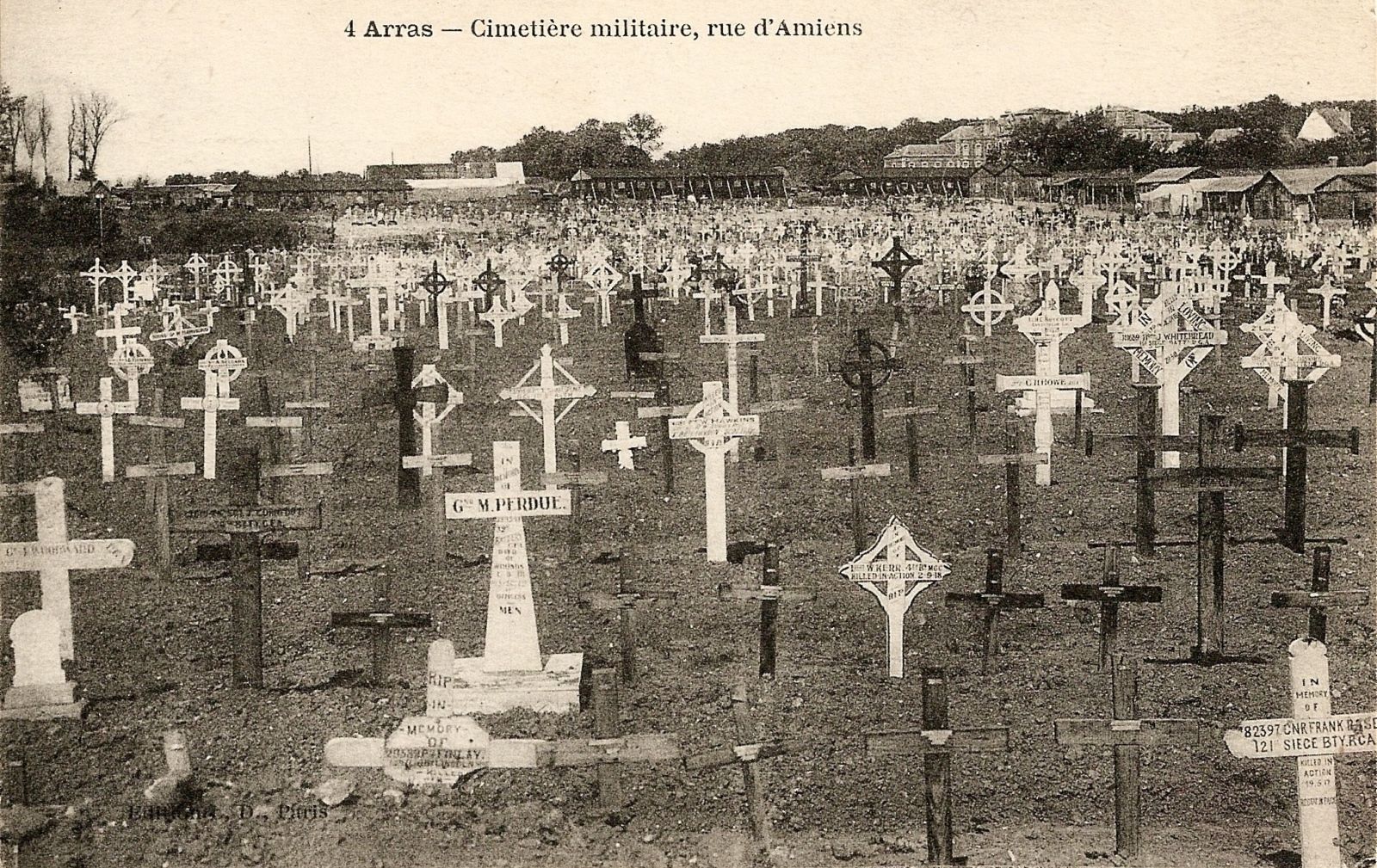 En 1914, le front s'installe à l'intérieur du cimetière d'Arras. Les tranchées sont érigées au milieu des tombes et des chapelles. Un cimetière provisoire est donc créé dans le Faubourg d'Amiens, derrière le couvent des bénédictines du Saint-Sacrement.