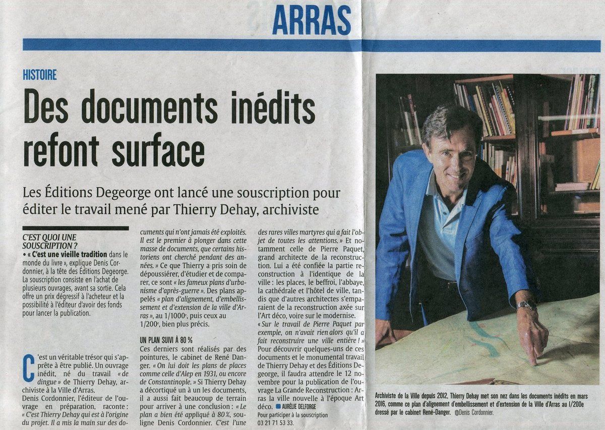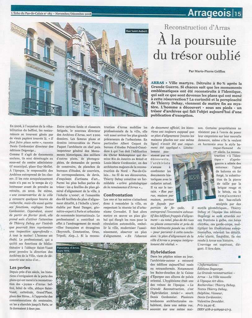 "Si chacun sait que les monuments emblématiques ont été reconstruits à l'identique, qui sait ce que sont devenus les plans qui ont mené à cette résurrection ? La curiosité et la perspicacité de Thierry Dehay, viennent de mettre fin au mystère. L'homme a découvert, sous ses pieds - un trésor d'archives qui fait l'objet aujourd'hui d'une publication d'exception [...] Avec clarté, limpidité, ils [Thierry Dehay et l'équipe des éditions Degeorge] ont rendu à Arras son histoire. L'ouvrage est captivant, élégant. Il fera date." Les Echos du Pas-de-Calais